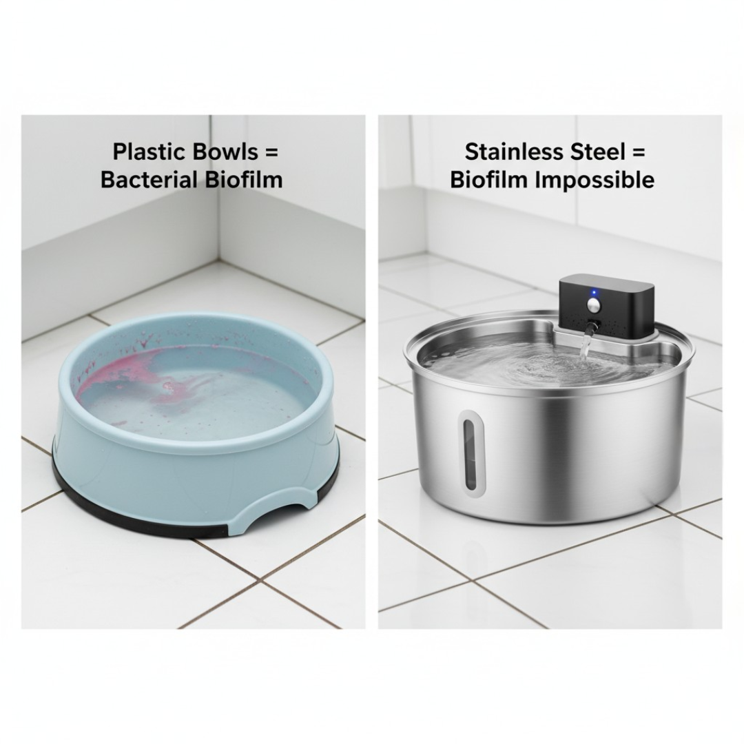 Within hours of filling any bowl, an invisible biofilm begins to grow. You cannot see it, but your cat can smell it instantly because they have ultra sensitive chemoreceptors.